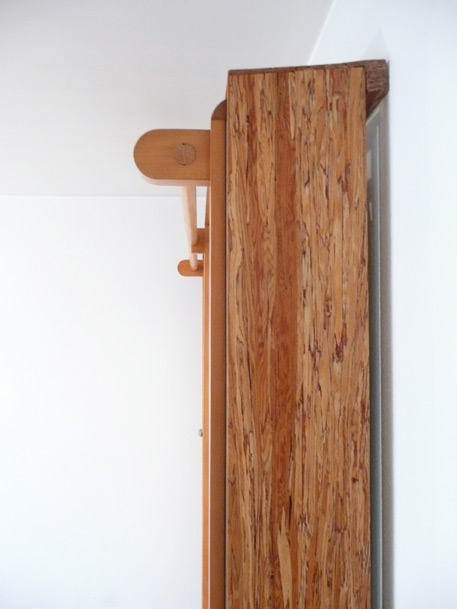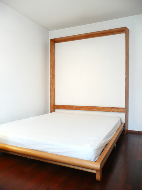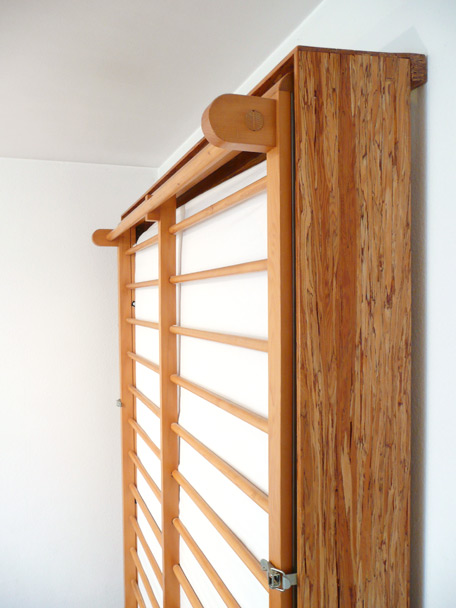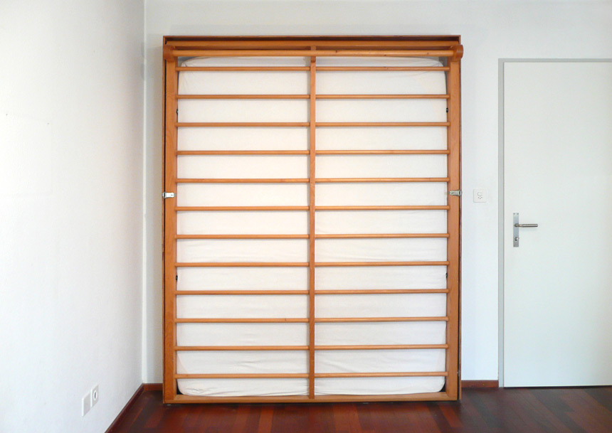 Im normalen Zustand, wenn das Bett hochgeklappt ist, steht eine Sprossenwand für sportliche Übungen zur Verfügung. Ohne grosse Mühe kann es aber auch in eine Schlafgelegenheit für Gäste usw. verwandelt werden.