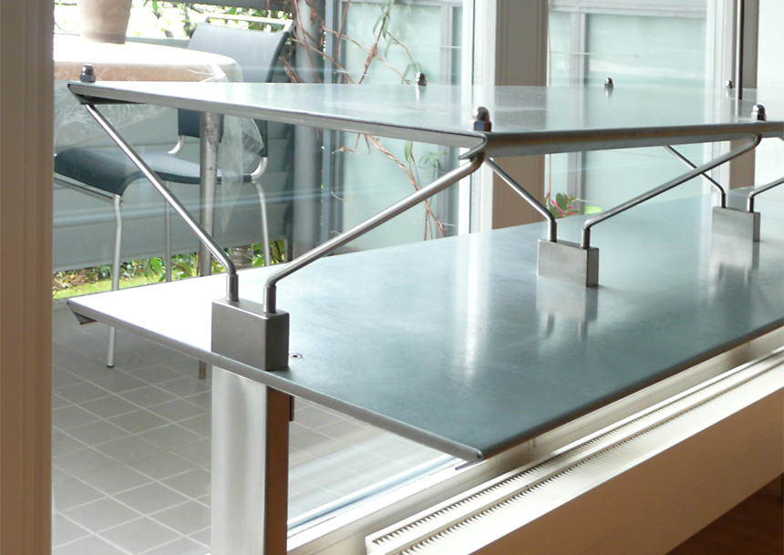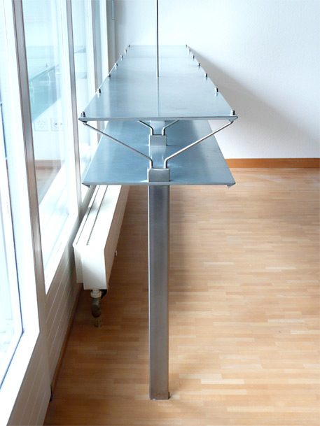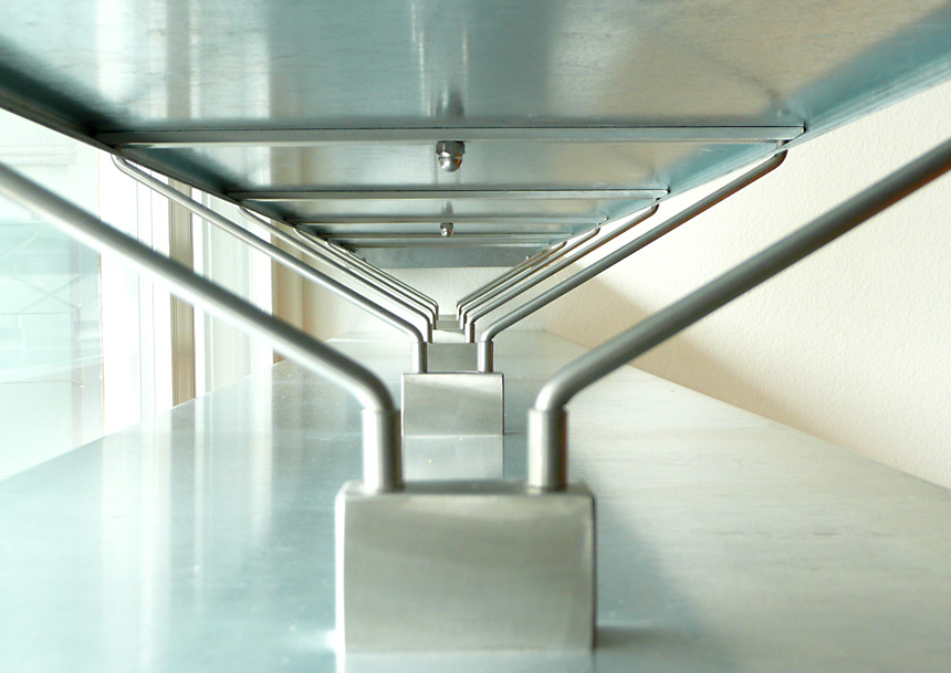 Das Interessante an diesem filigran wirkenden Metallboard sind die Tablare. Durch eine spezielle Konstruktion hängt das untere Tablar fest und sicher an der oberen Platte. Dabei entsteht der Eindruck, als würden beide Tablare frei schweben.