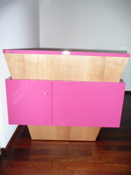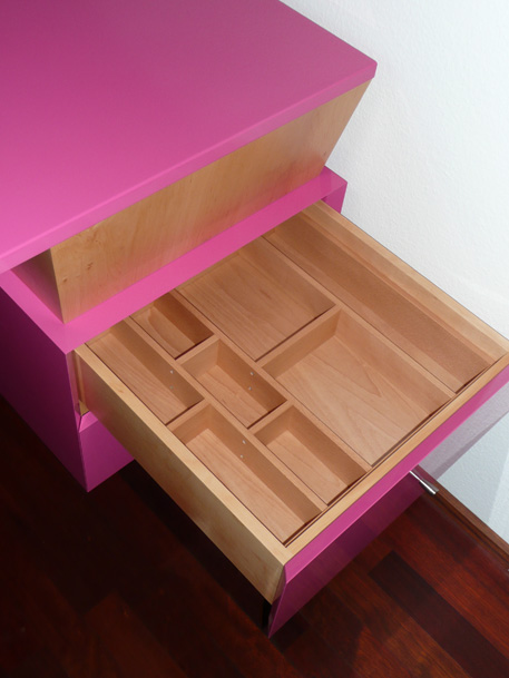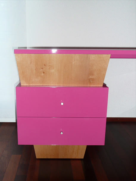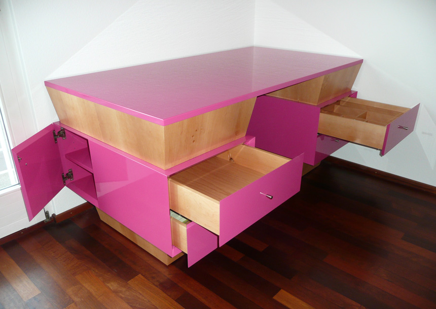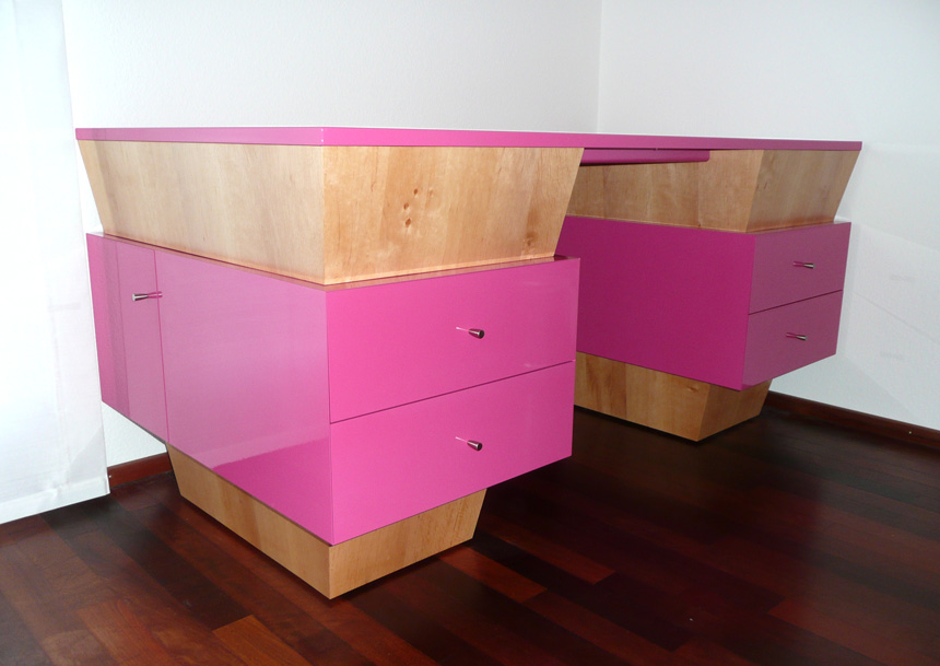 Der Schreibtisch ist ein wahres Schmuckstück. Alle Details sind sehr formschön verarbeitet. Durch die konisch verlaufende Säule erscheint der Schubladenblock leicht und elegant.